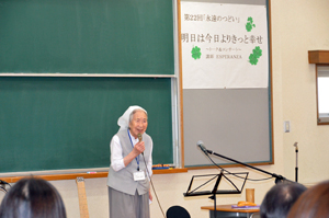 平成26年6月29日(日)に第22回永遠のつどいが開催されました。総会後、ESPERANZA氏による「明日は今日よりきっと幸せ ~トーク&コンサート~《の講演が行われました。お二人の軽快なトークと美しいフルート・オカリナの音色で会場は感動に包まれました。夢を持ち続けることの大切さに改めて気づき、幸せを感じながら生きることを考えた90分でした。最後は、全員で校歌を歌い閉会しました。