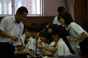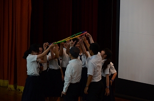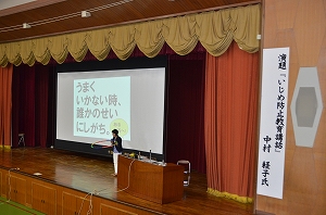 臨床心理士の中村経子先生をお迎えして、『みんな違ってタイヘンだ!』と題された、いじめ防止教育講演会を行いました。兵庫県の小・中学校、高等学校を中心にスクールカウンセラーとして活躍されている中村先生は東日本や熊本、そして中国の四川省などの被災地での心のケア活動も継続されています。講演では「人間の五つの特徴」についてワークやゲーム、映像を交えながら、わかりやすく説明され、実り多い人生を送るためには、人を好きになることがもっとも大切であると話されました。