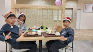 12月20日(土)に本校の食堂で子ども食堂を開催しました。今年もボランティア活動でお世話になっている「NIKAIMACHIきらきら子ども食堂」の方々のご協力のもと、チキンのトマト煮やコーンライスなどを地域のご家族に提供しました。