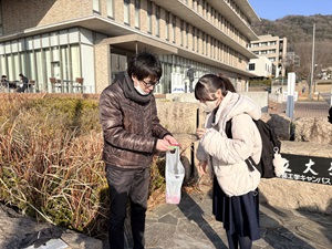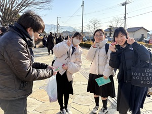 会場前で先生からお守りがわりのお菓子を受け取り、笑顔で向かうみんなが頼もしかったです。