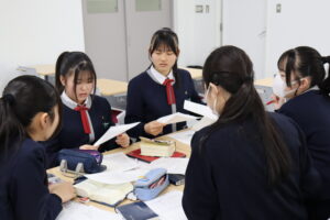 その後、各クラスで5~6人のグループを作り、「今の自分が大切にしている言葉」や「好きな聖書の箇所」について分かち合う時間を持ちました。分かち合いの内容は、全体で発表し、互いに共有しました。