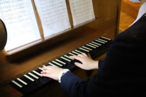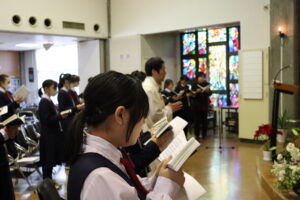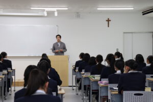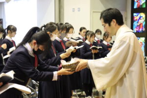 最後は、カトリック姫路教会にて「みことばの集い」を行いました。生徒一人ひとりが書いた祈りのカードを奉納し、祈りや聖歌を捧げるとともに、神父様のお話を伺いました。